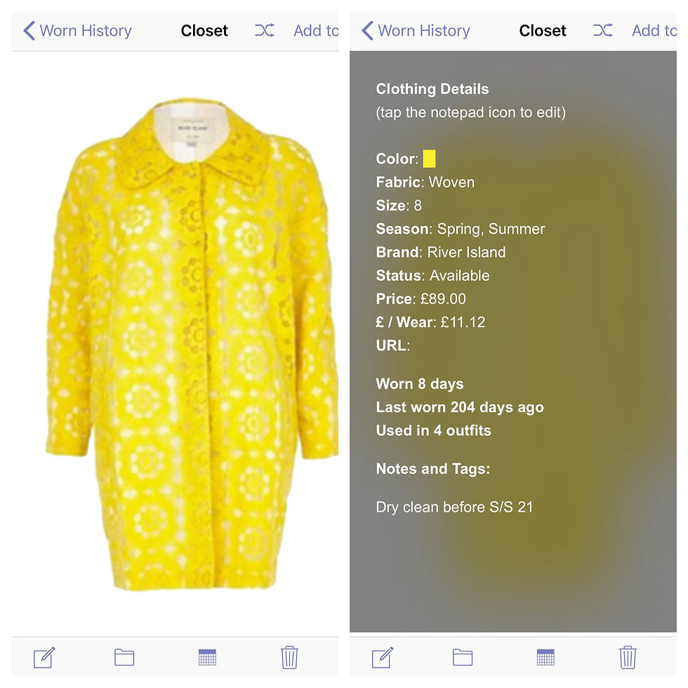 The app was great, but to set it up, meant that I had to photograph everything I owned, or search for an image online, and then attribute it – what it is, where it's from, the fabric and the price, before uploading it. I wanted this project to mean that everything I owned was on there, so I began by pulling all of my dresses out, photographing each one, attributing, putting them all away, and moving on to the next category of tops, and then skirts – and so on, all the way to accessories, including jewellery, sunglasses, belts and footwear too of course. It took about two weeks, including two whole weekends of photographing/searching for an image online, and attributing/uploading in the week too, on the way to and from work as well as in the evenings. Then the fun really began!