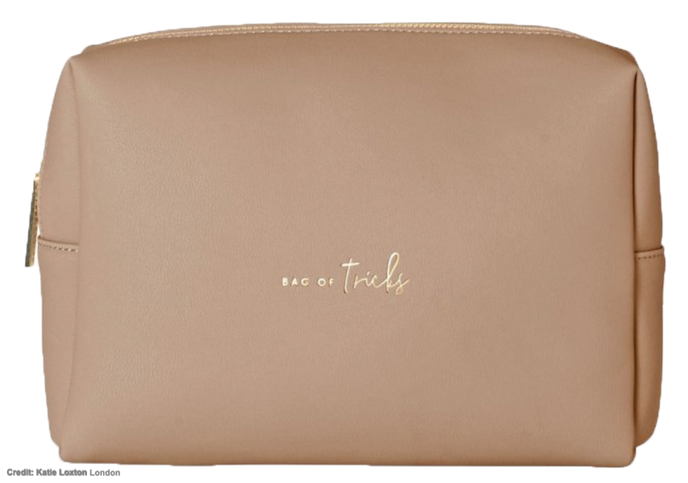 I love this cosmetic bag in a gorgeous golden hue with sophisticated pink lining – perfect for home make up storage or for having in your handbag, as well as travelling too. With a gold hardware zip and fun “Bag Of Tricks” slogan, it's perfect for storing your favourite beauty products in, because you can't store your best products in anything less than luxury looking!